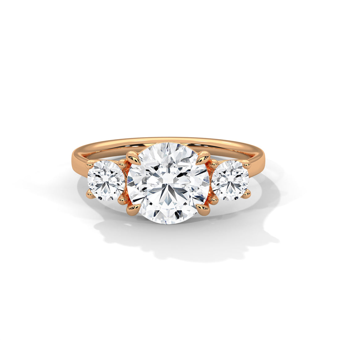 Three Stone Round Diamond Engagement Ring in Rose Gold – Classic Trilogy Diamond Ring with Side Stones