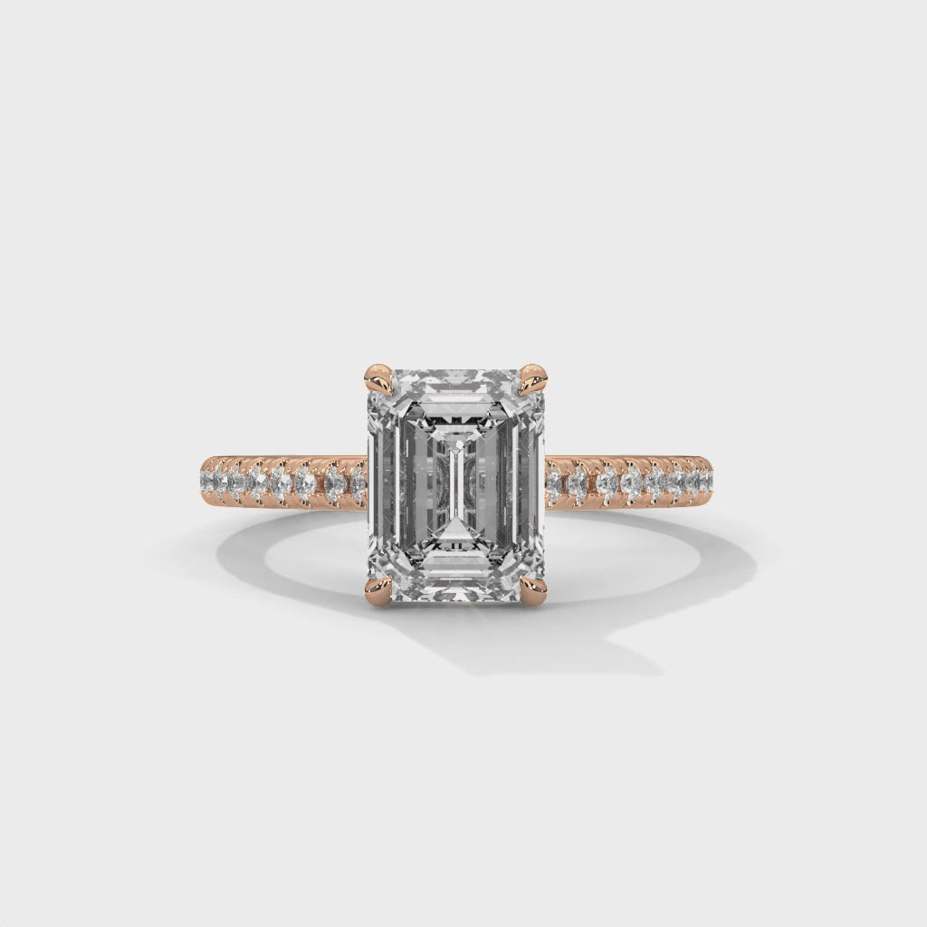 Emerald Cut Diamond Engagement Ring in Rose Gold – Pavé Diamond Band Ring – Classic Emerald Cut Proposal Ring