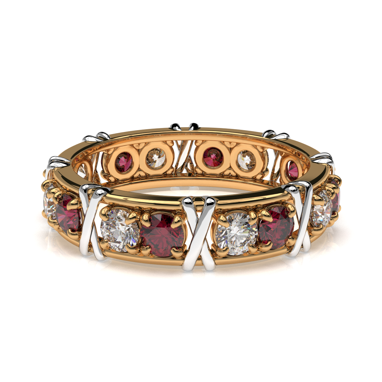 The bold X-style setting enhances the brilliance of each stone while giving the ring a strong, luxurious presence. Whether worn as an anniversary ring, wedding band, or statement daily wear piece, this design delivers timeless beauty with modern elegance.