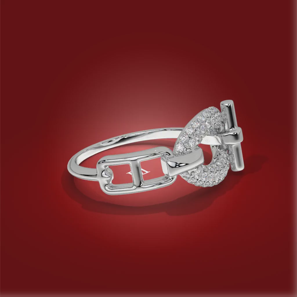 The Nexus Ring is a masterpiece of modern design and intricate connection. Its stunning central link, with its polished T-bar and diamond-encrusted loop, is a true work of art. This ring is more than a simple accessory; it’s a powerful focal point that symbolizes the central connections that hold everything together.