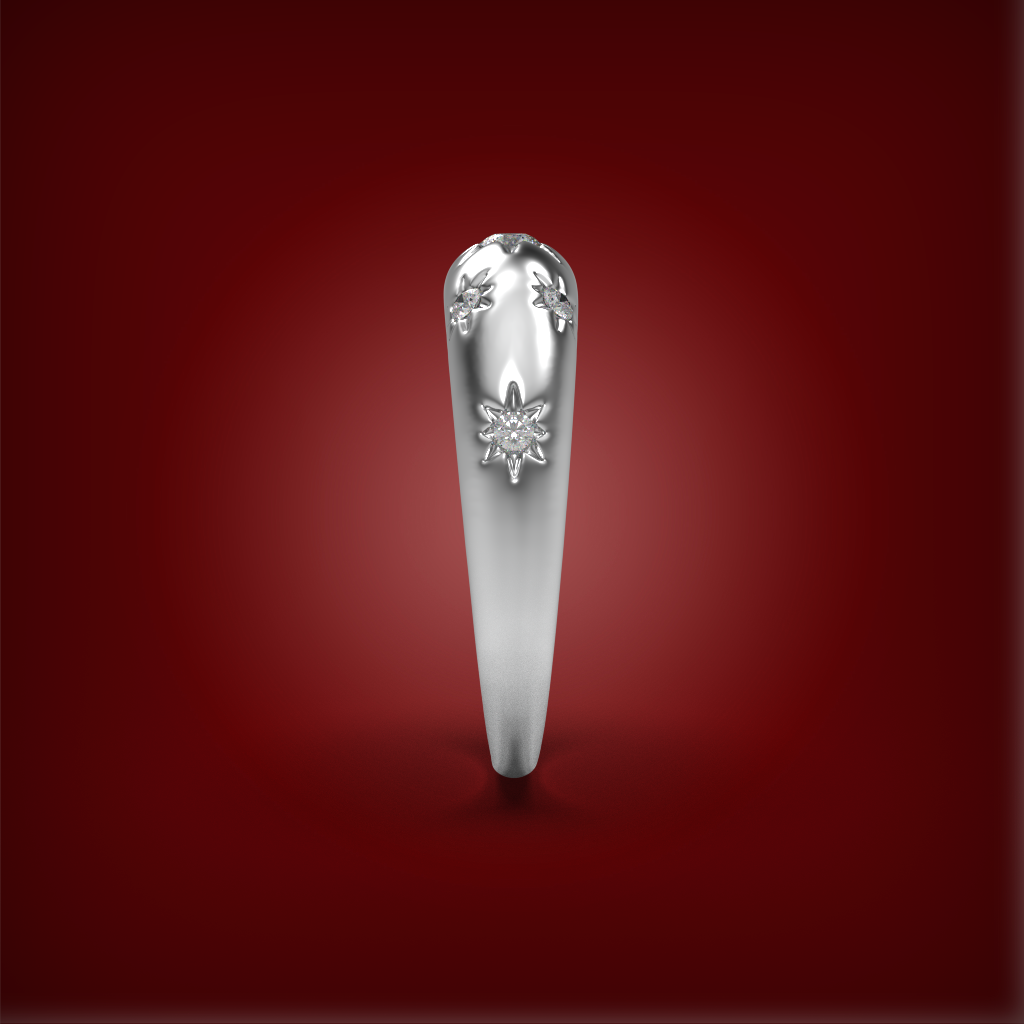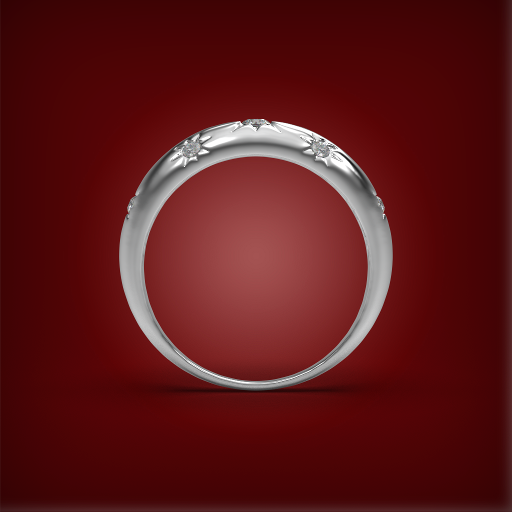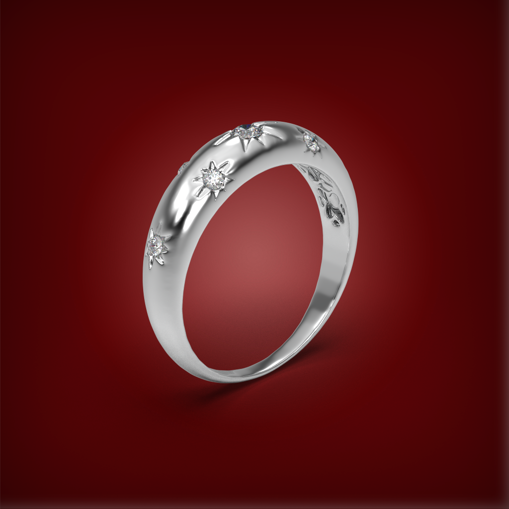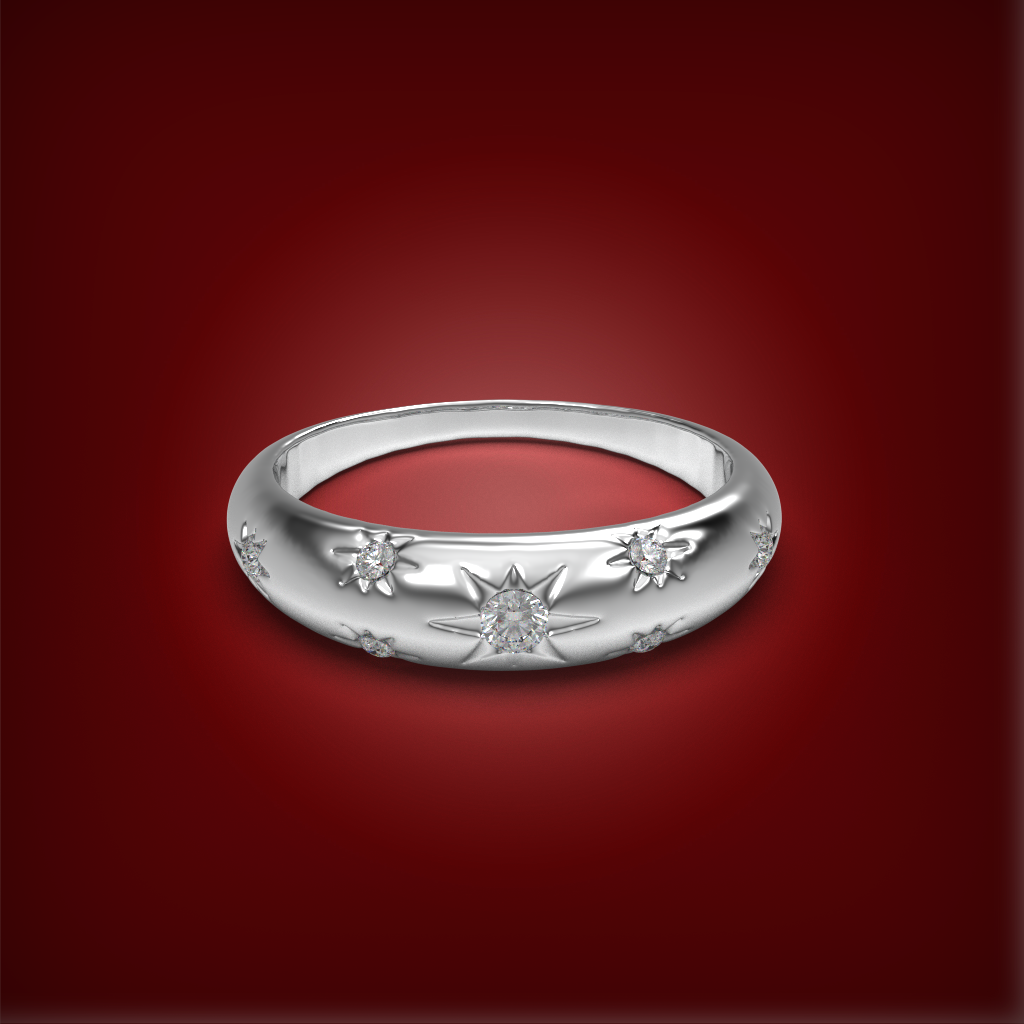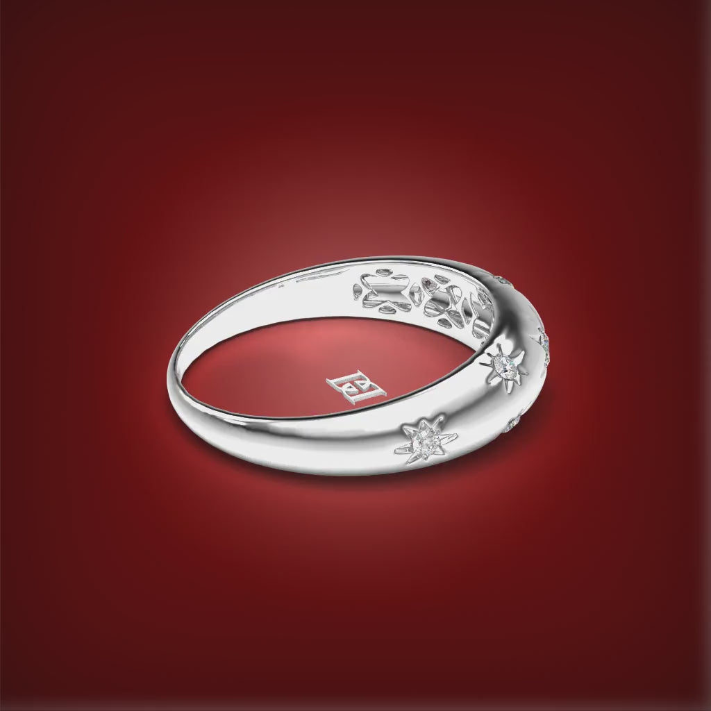 The Celestial Ring by D'House Jewels captures the magic of the night sky in a bold, polished design. This dome-style band features a seamless, brilliant white-metal finish, serving as the perfect canvas for its engraved starburst pattern. Each deeply etched star holds a shimmering diamond or crystal accent at its center, creating subtle, celestial sparkle. Comfortable and distinctive, this ring is a powerful yet understated statement piece designed to be worn as a reminder of wonder.
