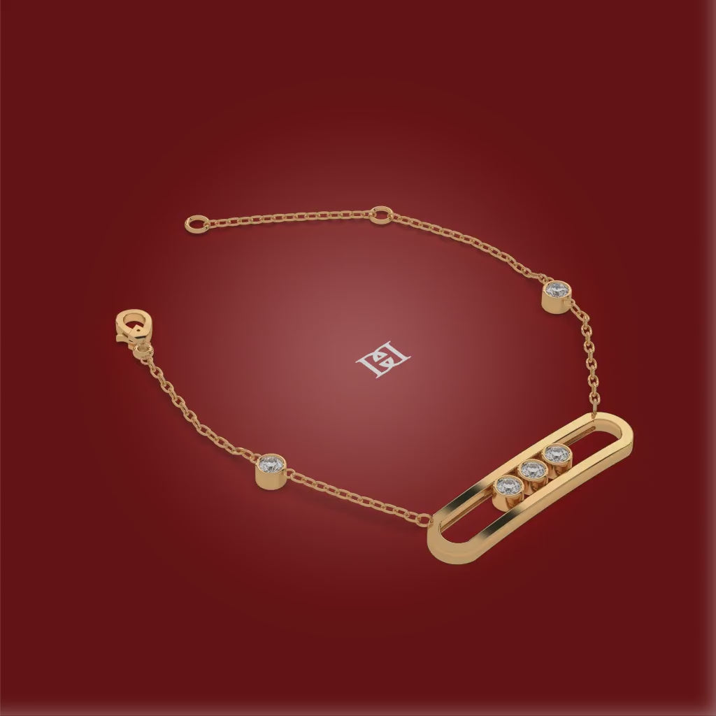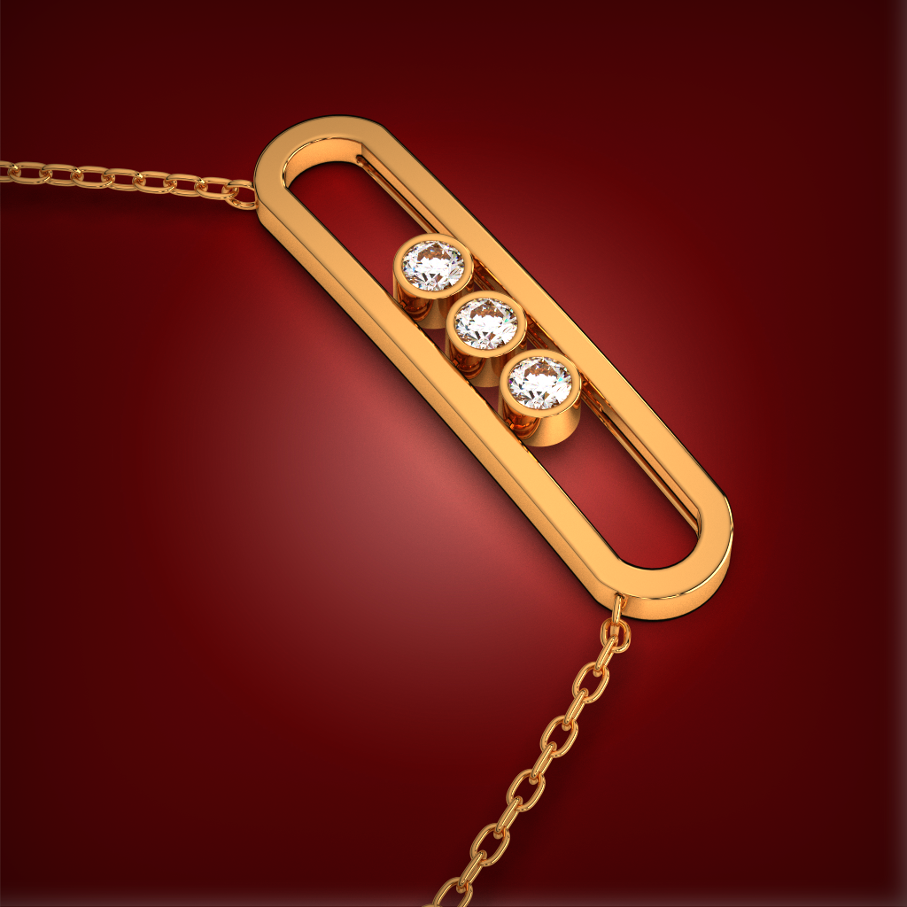 The Meridian bracelet is a sophisticated statement of modern elegance. Its sleek, polished gold bar provides a perfect central line, setting the stage for three brilliant-cut diamonds that appear to glide effortlessly within their unique setting. This necklace is a masterpiece of precision and fluid design, a luxurious accessory that will bring a touch of timeless brilliance to any look.
